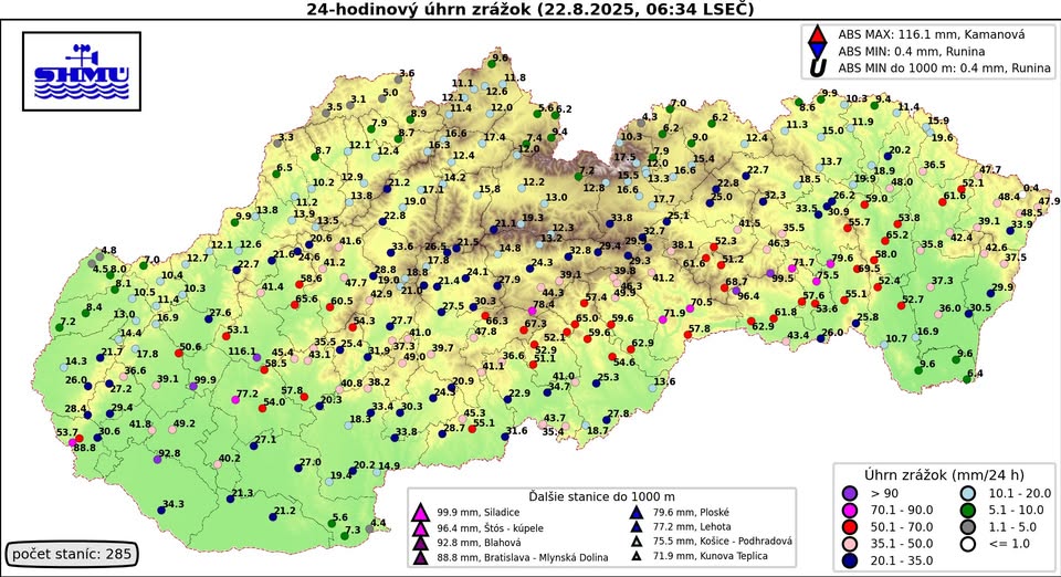 Do dnešného rána tak spadlo na viacerých miestach 10 až 30 a miestami 30 až 80 litrov vody na meter štvorcový. Ojedinele však boli úhrny aj vyššie a napríklad v Kamanovej sme zaznamenali úhrn až 116 mm a v Siladiciach prakticky 100 mm.
