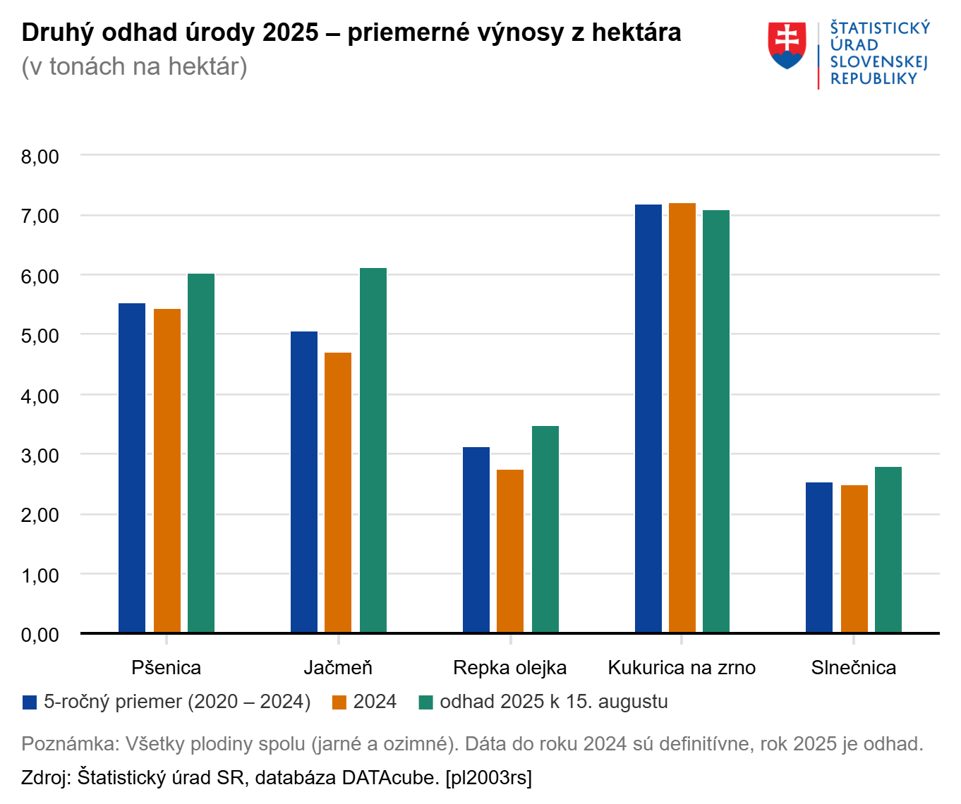 Druhý odhad potvrdzuje, že hektárové výnosy hustosiatych obilnín prevýšia nielen minuloročnú úroveň, ale aj päťročný priemer. Celková úroda pšenice, ktorá tvorí viac než dve tretiny plôch hustosiatych obilnín, by mala v roku 2025 dosiahnuť 2,3 mil. ton, čo je o pätinu viac ako vlani. Odhadovaný nárast produkcie o 390-tisíc ton súvisí najmä s medziročným rozšírením osiatych plôch o 9 % a lepším hektárovým výnosom. Oproti minulému roku bude hektárový výnos vyšší o 0,5 tony a dosiahne tak hodnotu 6 ton z hektára.