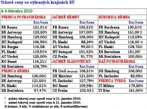 V tabuľke uvádzame prehľad aktuálnych cien vybraných komodít v rozhodujúcich prístavoch, resp. obchodných miestach EÚ-27 k 4. februáru 2010 a ich porovnanie s cenami, za ktoré sa tieto komodity obchodovali k 21. januáru 2010. Pri každej komodite zároveň nájdete cenu, za ktorú bola obchodovaná na Slovensku alebo v Českej republike – to kvôli možnosti porovnať si cenové rozdiely komodít vo vzťahu k dopravným vzdialenostiam a následnému odvodeniu si dopravných nákladov do uvedených prístavov.