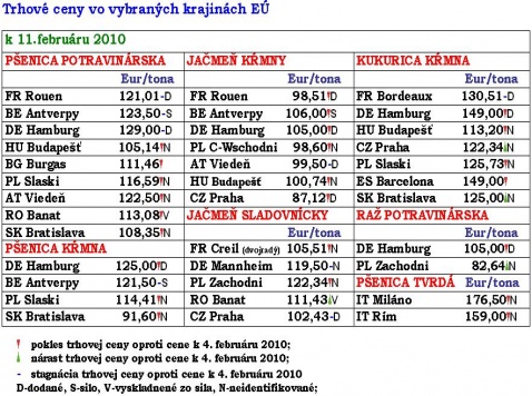 /upozorňujeme, že ide o mierne upravený text z 10. februára/ V tabuľke uvádzame prehľad cien vybraných komodít v rozhodujúcich prístavoch, resp. obchodných miestach EÚ-27 k 11. februáru 2010 a ich porovnanie s cenami, za ktoré boli obchodované na daných miestach k 4. februáru 2010. Zároveň pri každej komodite nájdete ceny, za ktoré boli tieto komodity obchodované na Slovensku alebo v Česku – a to pre možnosť porovnať si rozdiely v cenách komodít vo vzťahu k dopravným vzdialenostiam a následnému odvodeniu si dopravných nákladov do uvedených prístavov, či obchodných miest.