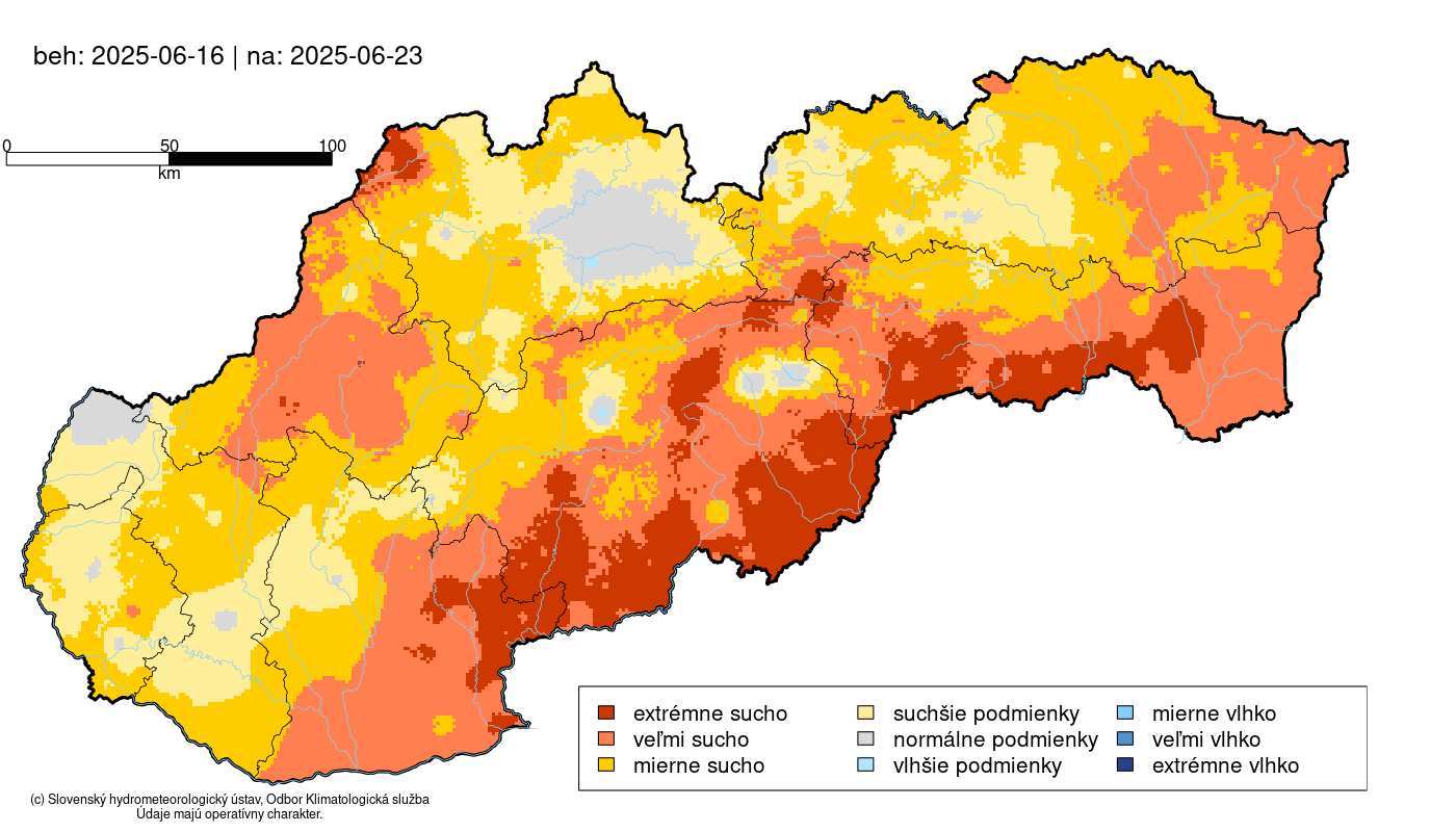 „Podľa pravdepodobnostnej ansámblovej predpovede bude aj podľa najvlhšieho scenára na siedmy deň výrazne rásť intenzita meteorologického sucha, ktoré sa prejaví aj vo výraznom prehĺbení pôdneho sucha. Predpoveď podľa strednodobého modelu ECMWF na deviaty deň (25. 6.) očakáva výskyt extrémneho pôdneho sucha na viac ako polovici územia Slovenska, pričom celé územie krajiny bude spadať do niektorej z kategórií sucha,“ skonštatovali hydrometeorológovia.