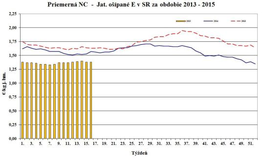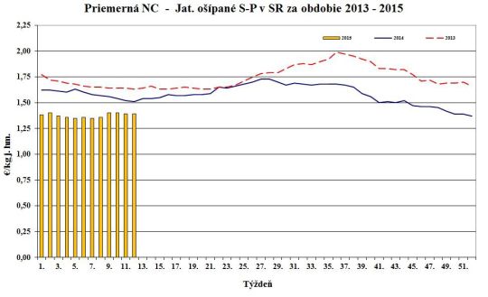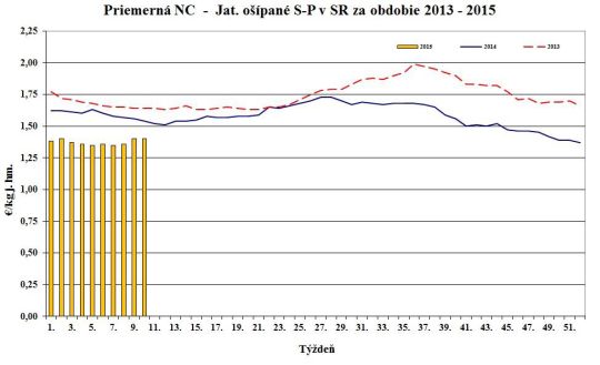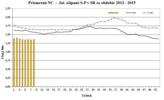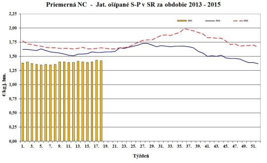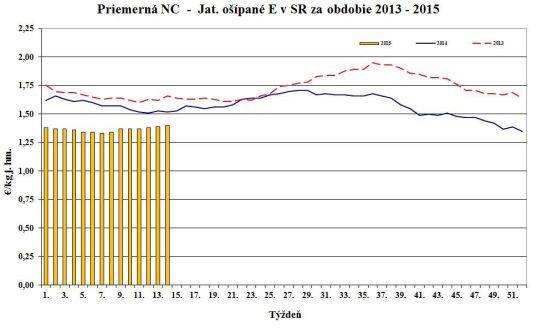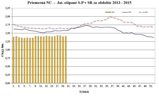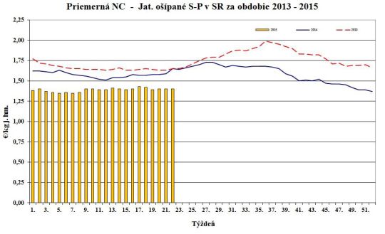 Nákupná cena jatočných ošípaných v porovnaní s 34. týždňom 2015 oslabila pri ľahkých (-3,8 %) a ťažkých ošípaných (-1,4 %). Naopak, stúpla v triedach S (+0,5 %), O (+3,0 %) a za ošípané S až P spolu (+0,5 %). Cena sa nezmenila v triedach E, R a pri prasniciach. Cena jatočných ošípaných sa pohybovala od 1,36 do 1,97 €/kg j. hm. Priemerná nákupná cena mierne posilnila o 0,2 % na úroveň 1,44 €/kg j. hm. (1,14 €/kg ž. hm.).