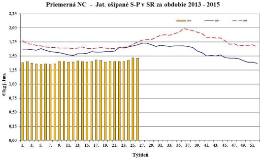 Kravy – Priemerná cena sa pohybovala v rozpätí od 1,16 do 2,10 €/kg j. hm. Nákupná cena klesla v triedach R (-3,8 %) a O (-0,8 %). V triede P sa cena nezmenila. Priemerná cena za kravy spolu stúpla o 0,8 % na 1,52 €/kg j. hm. (0,78 €/kg ž. hm).