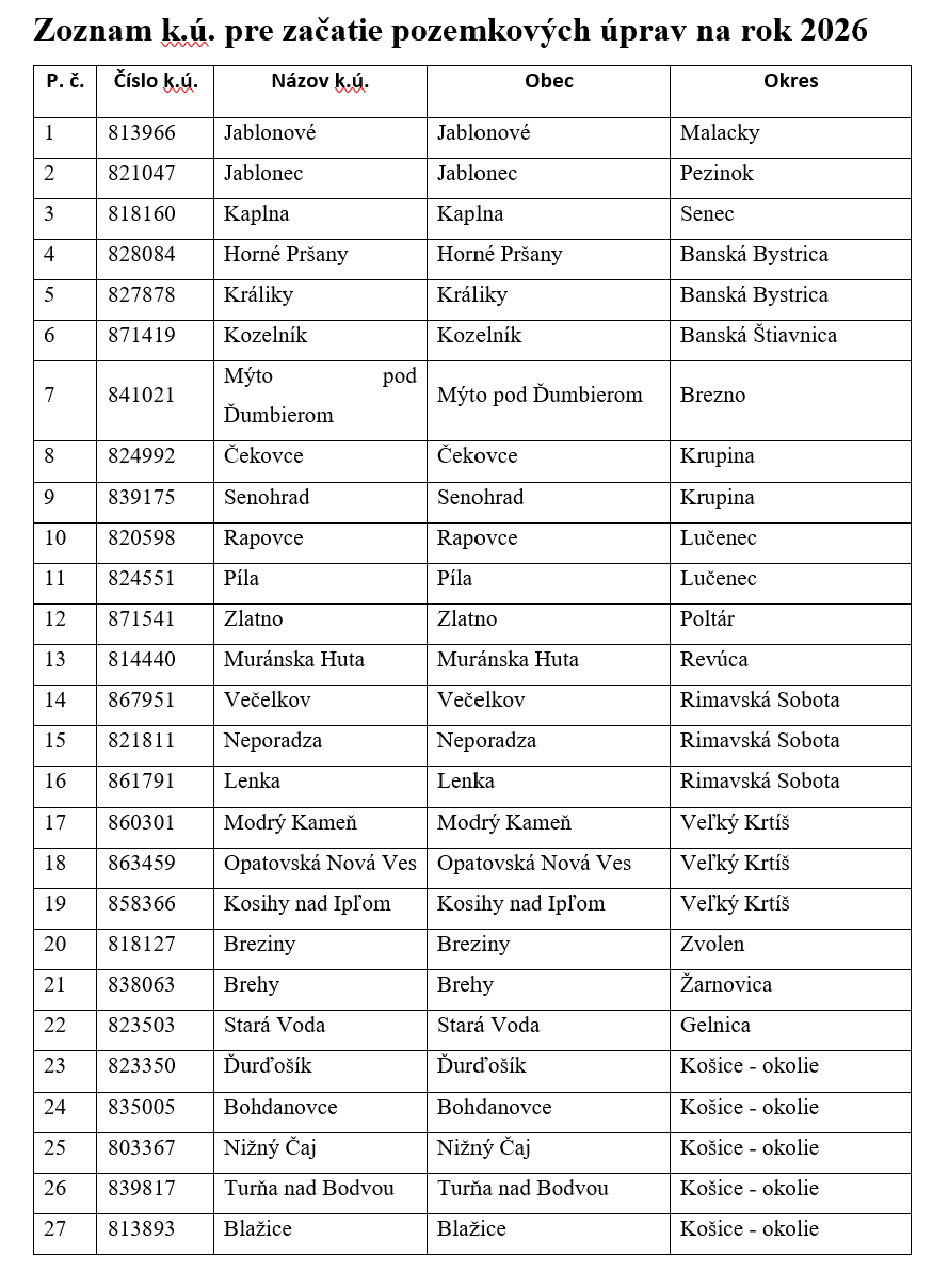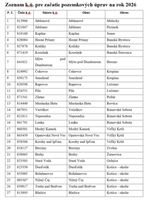 Zoznam 120 katastrálnych území pozemkových úprav pre rok 2026